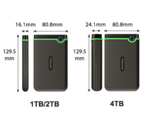 | Dimensions | 1TB/2TB: 129.5 mm x 80.8 mm x 16.1 mm (5.10″ x 3.18″ x 0.63″) 4TB: 129.5 mm x 80.8 mm x 24.1 mm (5.10″ x 3.18″ x 0.95″) |